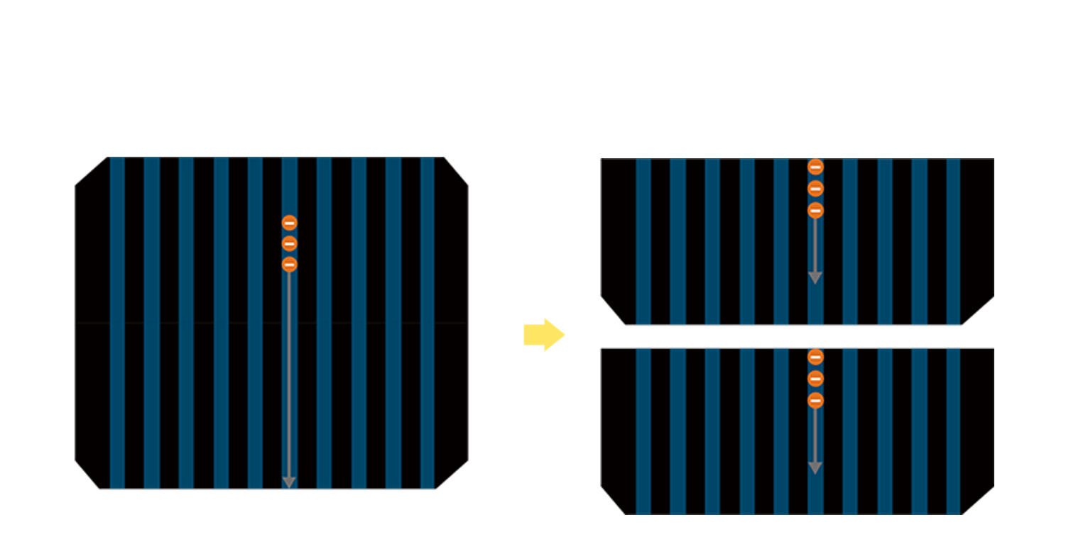 - 结合半切电池,降低遮阴影响、提升模组抗隐裂能力、并减少电阻损耗,进一步提升模组发电效能。
